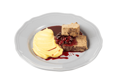Готовый мясной хлеб нарезать крупными ломтиками, подавать с картофельным пюре и вишневым соусом.