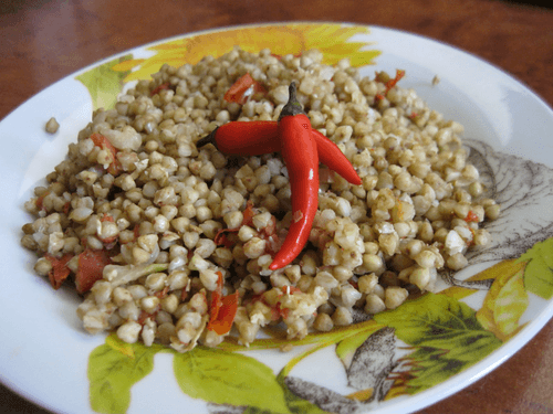 Зеленая гречка с помидорами, луком и чесноком