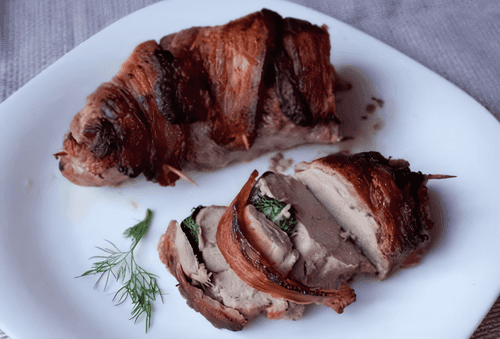 Кусок филе телятины отбить, посолить-поперчить по вкусу, посыпать зеленью, выложить на мясо чернослив без косточки, обернуть филе полосками бекона и перевязать кухонной ниткой.