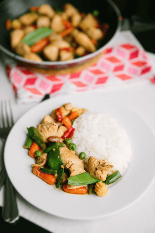 На сковороде (если есть вок — отлично!) разогреть 1 ст.л. масла и на большом огне обжарить курицу, постоянно перемешивая, до золотистого цвета (займет около 5 минут максимум). Добавить овощи, убавить огонь до среднего и жарить, периодически перемешивая, до готовности овощей (у меня заняло 10 минут). Подавать с рисом. Если нет аллергии, можно посыпать рублеными орехами — обжаренными арахисом или кешью, — они сюда отлично впишутся.