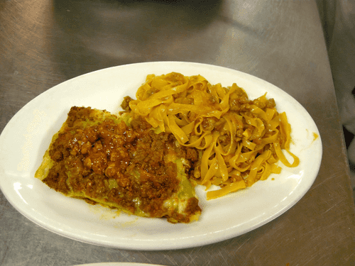 Затем добавить на сковороду мелко нарезанный лук, сельдерей и морковь (все нарезается вручную). Убавить огонь и тушить почти до готовности.