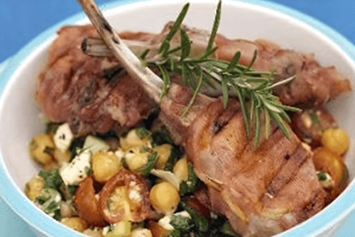 Баранина в беконе на гриле с салатом из овощей и козьего сыра