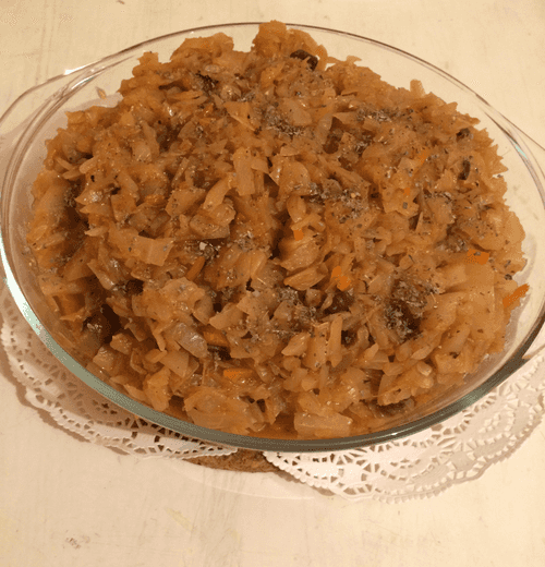 600 грамм квашеной капусты и 400 грамм свежей белокочанной капусты мелко нарубить, залить кипящей водой и слегка отварить.
