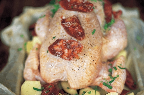 В форму для запекания выложить картофель, сверху — курицу, и посыпать колбасой чоризо и мелко нарубленными листьями петрушки. Сбрызнуть оливковым маслом и запекать в течение 1,5 часов.