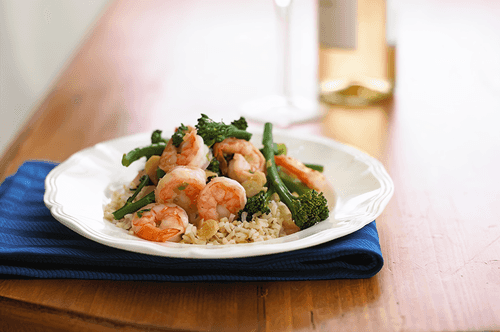 Готовый рис отправить к курице (которая уже на сковороде), на максимальной температуре обжаривать их вместе в течение 6 минут. Затем добавить к блюду креветки.