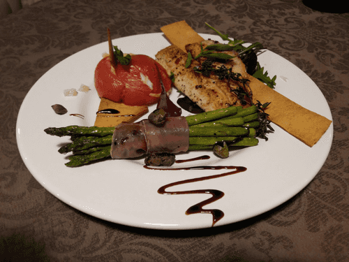 Филе сибаса со спаржей в беконе