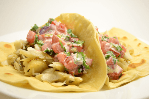 Сервировка. На тортилью выкладываем часть трески и сверху 1/8 часть соуса сальса.