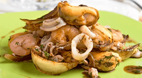 Рагу сделать из морского коктейля. Это замороженная смесь морепродуктов – очищенных креветок, порезанных кальмаров, маленьких осьминожек, крупных мидий, кусочков морских гребешков. У разных товаропроизводителей эта смесь может быть разной. Можем сами сделать такую смесь, купив все ингредиенты отдельно.