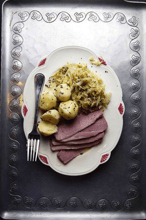 Тем временем почистите и нарежьте крупными кусками картофель. Налейте воду в кастрюлю, посолите, добавьте картофель и варите до готовности. Капусту нашинкуйте, выложите в кастрюлю, посолите, добавьте сок лимона и 1/2 стакана воды. Накройте крышкой и доведите до кипения. Томите на медленном огне около 30 минут, пока капуста не станет мягкой. Готовый картофель и капусту выложите на тарелки. Солонину нарежьте ломтиками поперек волокон и разложите по тарелкам. Полейте соком мяса и подавайте теплым. Приятного аппетита!