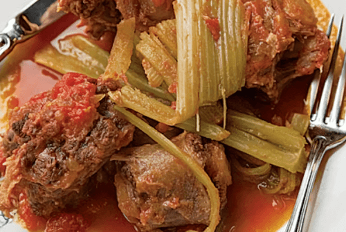 Нарезанную ветчину, 5 нарезанных стеблей сельдерея, мелко нарезанные чеснок, морковь и лук вместе с лавровым листом положите в казан и готовьте, пока не станут мягкими. Затем добавьте томатную пасту и готовьте, помешивая, 6 минут. Влейте вино и доведите до кипения. Продолжайте готовить, пока вино не испарится. Верните бычьи хвосты в казан, добавьте измельченные томаты и влейте 1 1/2 стакана воды. Убавьте огонь, накройте крышкой и томите на медленном огне около 2 часов.
