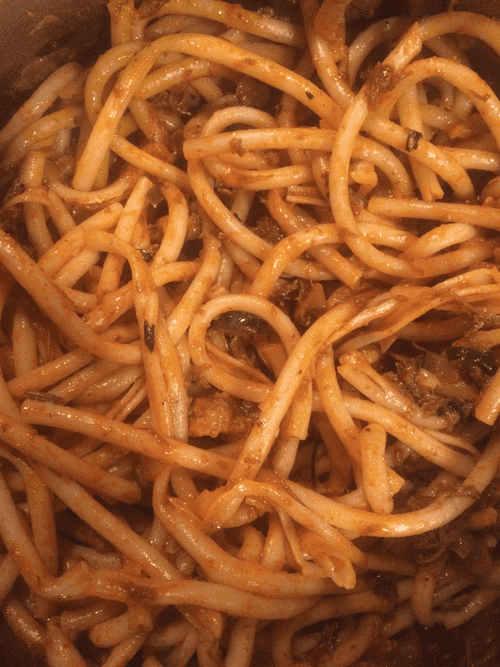 В кастрюлю с макаронами добавляем нашу зажарку, перемешиваем, и на слабом огне готовим еще 5-7 минут, под крышкой.