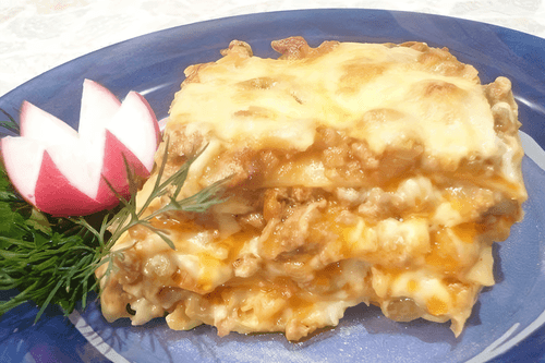 Лазанья с мясом, беконом и овощами под соусом бешамель