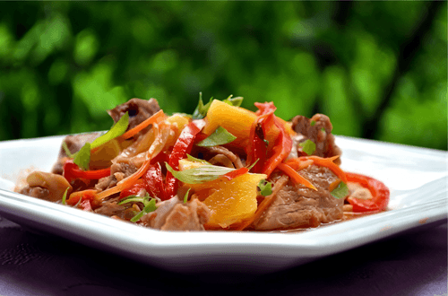 Поперчить индейку, быстро обжарить её с луком и чесноком на большом огне.