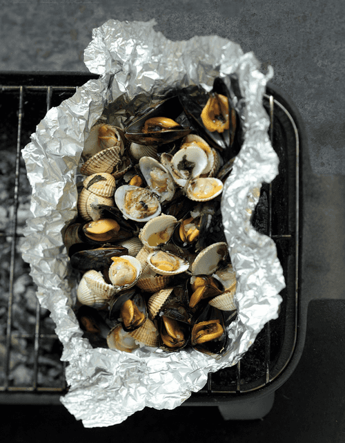 Развести огонь под барбекю. Выложить свертки с моллюсками на решетку и готовить в течение 10 минут. Подавать сразу.
