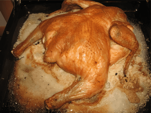 После того как курица будет готова, ножом убрать «солевой камень» (не бойтесь, курица не будет пересоленной, и местами вы возможно даже будете досаливать когда будете кушать).