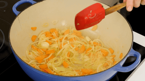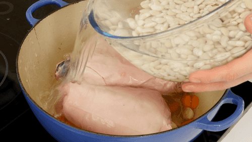 На ночь замочить фасоль в 7,5 стаканах воды. Разогреть 2 столовые ложки утиного жира (при необходимости его можно заменить оливковым маслом) в глубокой сковороде. Обжарить половину чеснока, крупно нарезанную морковь и лук до золотистого цвета, около 10 минут.