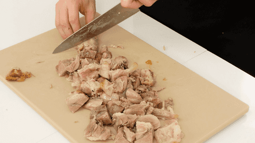 Вынуть свинину и преложить на тарелку, дать остыть. Снять кожу, оделить мясо от кости и крупно нарезать.