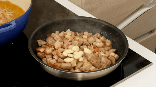 В сковороде с толстым дном разогреть 2 столовые ложки утиного жира. Обжарить свиную лопатку в течение 8 минут до золотистой корочки, добавить бекон, готовить еще 5 минут. К мясу вложить оставшийся чеснок, готовить 5 минут.