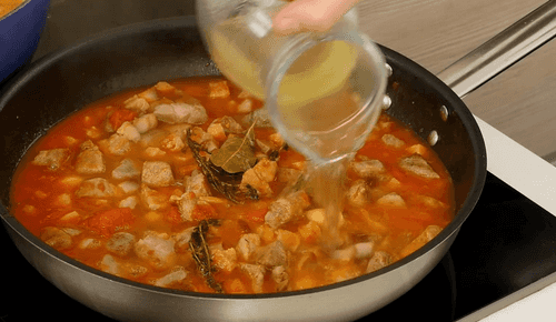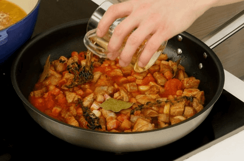Положить в сковороду к овощам тимьян и лавровые листы, добавить помидоры. Готовить до загустения 8-10 минут.