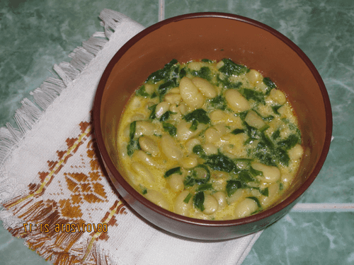 В кастрюле разогрейте оливковое масло и обжарьте в нем мелко нарезанный чеснок. Добавьте бульон (куриный или овощной), шафран и шпинат. Добавьте фасоль, сливки, а также соль, перец и паприку по вкусу. Перемешайте. Варите на слабом огне, периодически слегка помешивая еще примерно 10 минут.