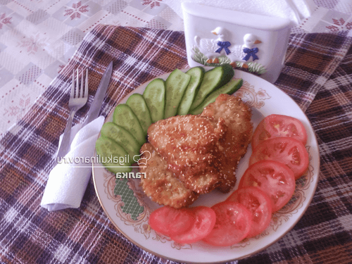 Так как отбивные у нас тонкие и готовятся быстро, надо внимательно следить за тем, чтобы они не подгорели. В противном случае маленькие угольки семечек будут не очень аппетитно смотреться на мясе. После полной готовности, подаем отбивные из кунжута к столу.
