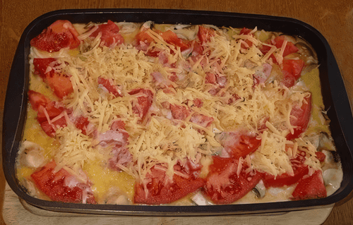 Свинина, запеченная с овощами под соусом бешамель