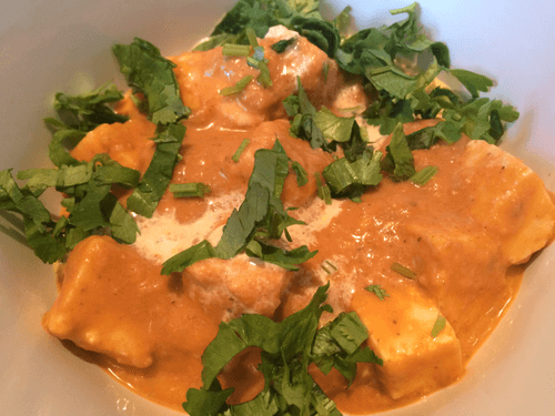 Адыгейский сыр (а лучше- панир (домашний сыр), режем кубиками комфортного для еды размера и добавляем в соус, готовим ещё несколько минут: даём сыру возможность впитать в себя все ароматы.