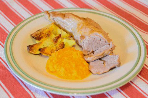Вырезку телячью или свиную обжарьте со всех сторон на сковороде с высокими краями. Залейте вином, подождите пока алкоголь выпарится из вина и засыпьте нарезанными на кубики морковкой и сельдереем, добавьте лавровый лист, закройте крышкой и оставьте тушиться на 40 минут. При необходимости можно добавлять воду или бульон.