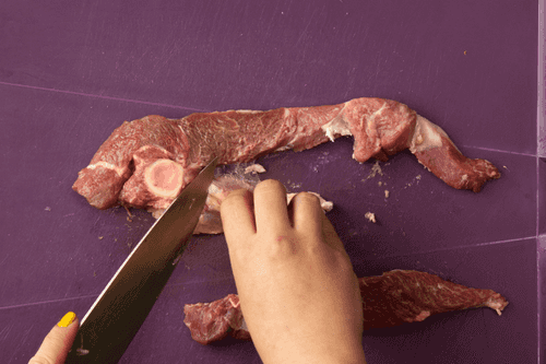 Разрезать стейки пополам, срезать лишний жир и вырезать кости.