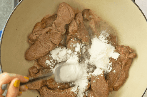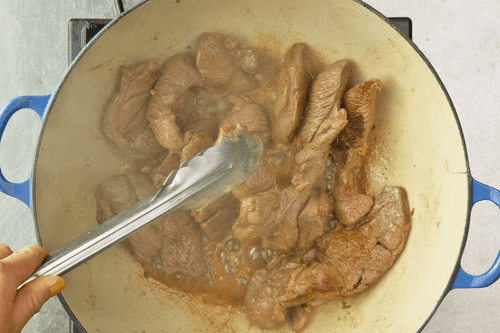 Разогреть оставшееся масло все в той же сковороде и обжарить куски баранины, посыпав их мукой и добавив специи по вкусу, в течение 1 минуты.