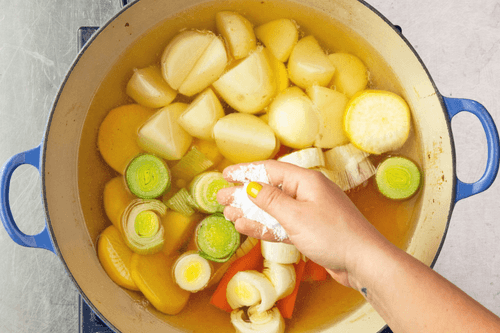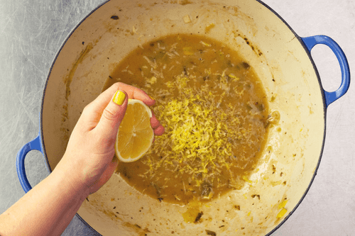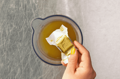 Отлить 450 мл овощного бульона и развести в нем бульонный кубик.