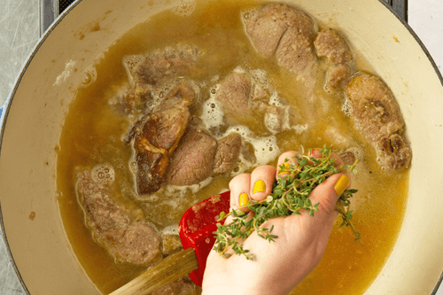 Влить бульон, вино, добавить крупно нарезанный зеленый лук и пару веточек тимьяна и довести до кипения. Томить, накрыв крышкой, в течение 1 часа на медленном огне, изредка помешивая.