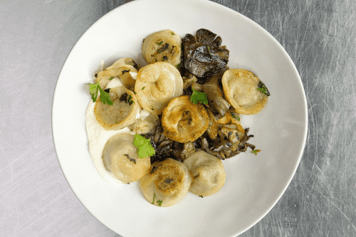 Добавить к ним соус из опят, довести до кипения и снять с огня. Затем выложить кундюмы вместе с соусом в тарелку, рядом выдавить мусс из пармезана и добавить немного укропа.