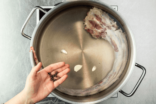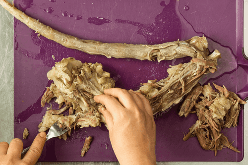 Хвосты отварить с добавлением лаврового листа, душистого перца, чеснока, корня петрушки до готовности (2-3 часа). Охладить, отделить мясо от кости. Бульон процедить.