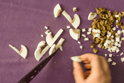 Белые грибы, шампиньоны и лук нарезать кубиком 5 мм и обжарить до готовности, посолить и поперчить.