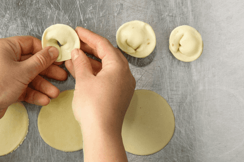Тесто раскатать как можно тоньше, вырезать круглой формочкой, разложить на тесто готовый фарш, смазать края теста водой и слепить в виде ушка.