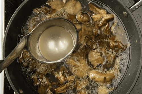Мясо порвать на волокна, немного измельчить, добавить грибы, измельченный чеснок, порвать веточки укропа, влить немного бульона и довести до вкуса солью и перцем.