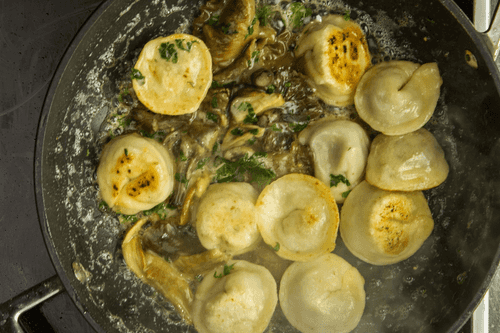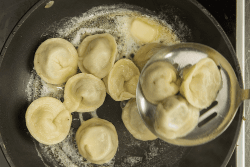 Отварить кундюмы в бульоне от хвостов и обжарить их на сковороде.