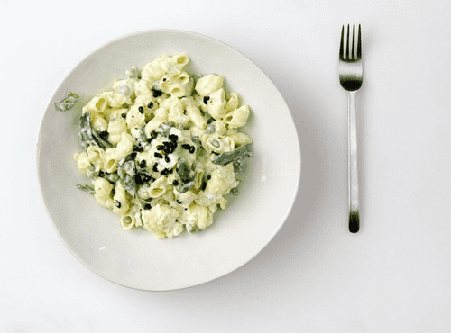Ракушки конкилье с йогуртом, зеленым горошком и чили