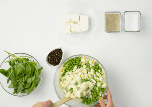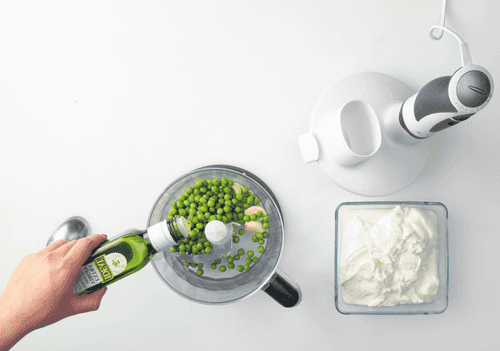 Перемешать в чаше комбайна йогурт, 90 мл оливкового масла, раздавленные зубчики чеснока и 100 г горошка. Если горошек замороженный, то его стоит предварительно бланшировать — опустить в кипяток на 30–40 секунд, а затем сразу же откинуть на лед. Превратить смесь в соус бледно-зеленого цвета и переложить в большую миску.