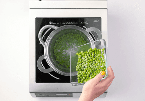 Также разогреть оставшийся горошек в кипящей воде, а затем откинуть его на дуршлаг.