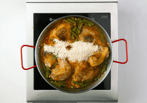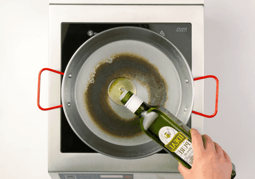 Налить масло в центр паэльеры и жарить мясо до корочки на сильном огне. Если масло горит, уменьшить огонь.