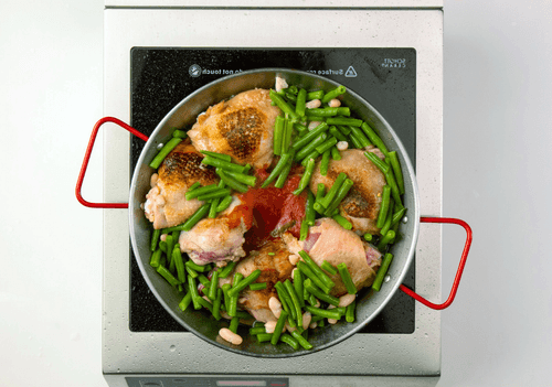 Добавить всю фасоль (свежие стручки нарезать), обжаривать еще несколько минут. Сделать в центре углубление и добавить помидоры, еще через пару минут паприку. Важно не дать ей пригореть, иначе будет горчить.