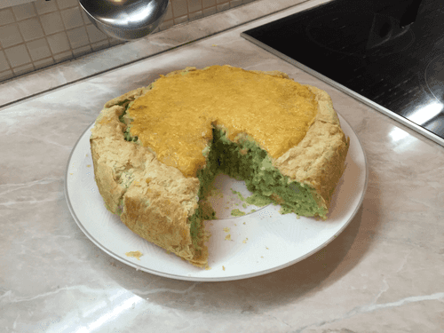Вылейте яичную смесь в пюре и хорошо перемешайте, затем выложите пюре в форму для выпекания с тестом и равномерно разровняйте его. Таким образом пирог с картофелем с брокколи и с сыром уже практически готов, осталось пару шагов.