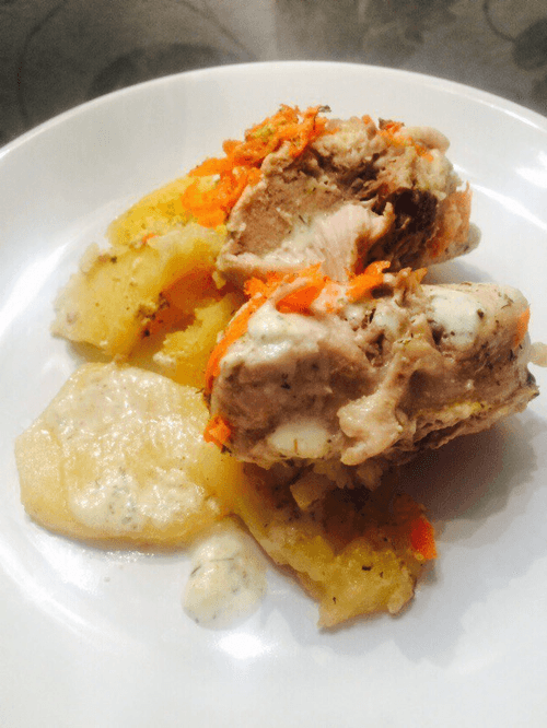 На смазанную маслом форму (противень) выкладываем тонким слоем картофель, вторым слоем лук, далее выкладываем кролика и морковь, сверху поливаем остатками соуса.