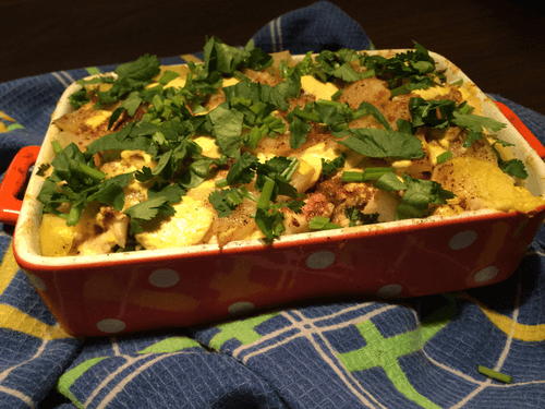 Затем заложить второй слой картофеля, специй и сыра в том же порядке, затем третий, только без зелени — оставьте её для украшения, когда будет готово.