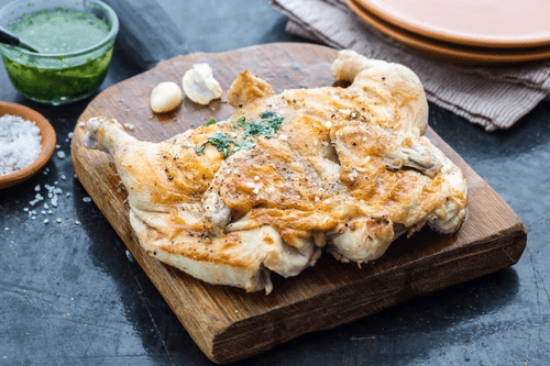 Разогрейте сковороду с растительным маслом и жарьте, начиная со стороны кожи. Накройте тушку вставкой для готовки на пару и придавите сверху чем-нибудь тяжелым. Обжаривайте цыпленка по 4–5 минут с каждой стороны. Подавайте с чесночным соусом.