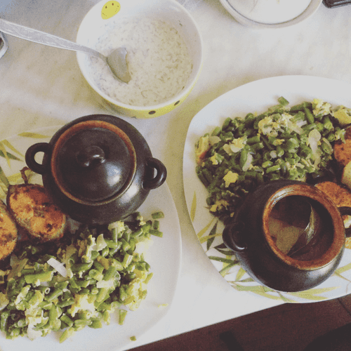Лосось с зеленой фасолью, картофелем, запеченным в горшочке и сметанным соусом