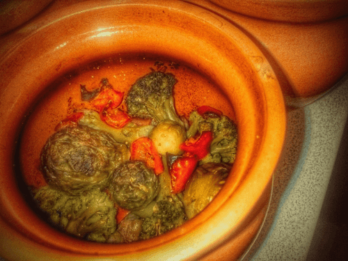 Пока жариться лук, смажьте горшочки оливковым маслом, выложите на дно говядину (можно слегка поперчить, посолить), сверху поджаренный лук, и сверху овощи (овощи я ложу замороженные, они дадут больше сока).
