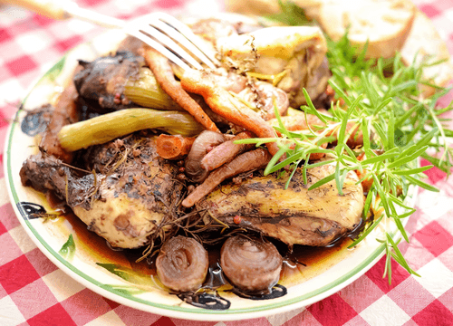 Курица в вине с грибами — изысканное блюдо европейской кухни, которое восходит к традиционной французской классике Coq au Vin. Этот рецепт превращает простые ингредиенты в шедевр гастрономии. Маринование курицы в красном вине наполняет её глубокими ароматами тимьяна, лаврового листа и черного перца, а медленное тушение делает мясо нежным и насыщенным. Дополнительно грудинка и шампиньоны придают блюду землистый вкус и аппетитную текстуру. Подается с зеленью петрушки, что придает свежесть и яркость. Этот рецепт идеально подходит для особых ужинов, когда хочется создать теплую, уютную атмосферу и насладиться многогранными оттенками вкуса.